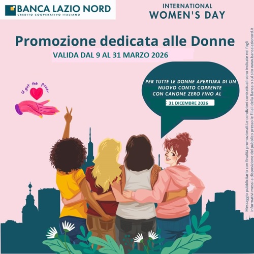 In occasione della Giornata Internazionale della donna, a tutte le donne che apriranno un nuovo conto corrente nella settimana dal 9 marzo 2026 al 31 marzo 2026, Banca Lazio Nord dedica una promozione speciale!
